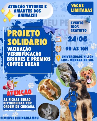 Neste sábado, 24 de maio, das 9h às 16h, estudantes de Medicina Veterinária da Universidade Nilton Lins, campus Manacapuru, realizarão a ação solidária “Meu Pet, Eu Amo, Eu Cuido”. O evento acontecerá na sede da universidade, localizada na Morada do Sol (antigo cinema).