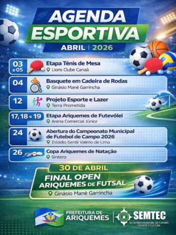 Entre os destaques, no dia 26 será realizada a Copa Ariquemes de Natação no Sintero, e no dia 24 terá início o Campeonato Municipal de Futebol de Campo 2026, com a abertura marcada para o Estádio Gentil Valério de Lima. Nos dias 17, 18 e 19, a Arena Comercial Júnior sediará a etapa local de futevôlei.