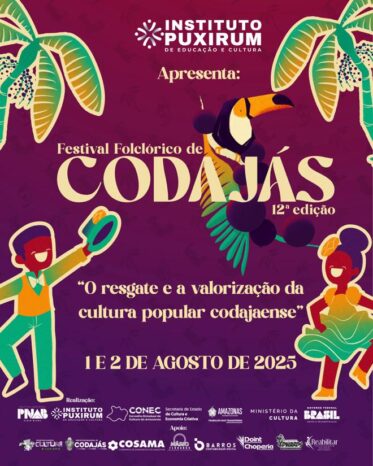 O município de Codajás sediará o 12º Festival Folclórico de Codajás, nos dias 1 e 2 de agosto de 2025, no Centro de Eventos Sidney Hernani, das 19h às 23h. Com o tema “O resgate e a valorização da cultura popular codajaense”, o evento será realizado sob a coordenação do produtor cultural Mário Fernando da Silva Santos, do Instituto Puxirum de Educação e Cultura, e conta com o apoio do Conselho Estadual de Cultura, da Secretaria de Estado de Cultura e Economia Criativa, do Governo do do Amazonas e do Governo Federal, através da Política Nacional Aldir Blanc (PNAB).