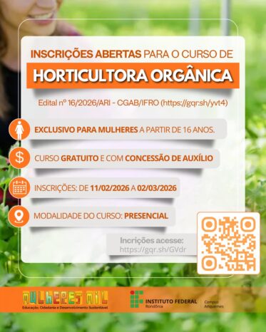 O Instituto Federal de Educação, Ciência e Tecnologia de Rondônia (IFRO) — Campus Ariquemes abriu inscrições para o Curso de Formação Inicial e Continuada (FIC) de Horticultora Orgânica, oferecido pelo Programa Mulheres Mil.