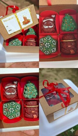 Para o período natalino, Thayza está oferecendo travessas de mousse, bombons com brigadeiros e frutas, além de uma guirlanda natalina comestível, pensada para compor a mesa e servir como sobremesa. Durante o Natal, os pedidos são feitos principalmente por encomenda, mas ao longo da semana também há atendimento por delivery.