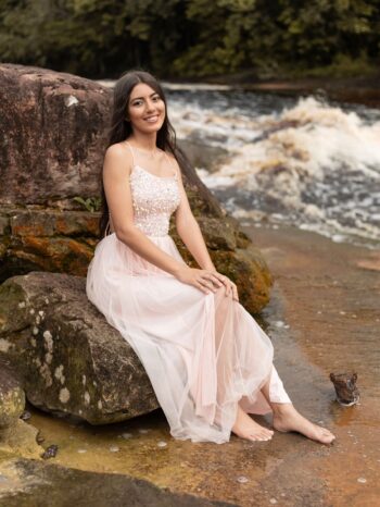 “Minha infância foi simples, mas cheia de amor. Cresci rodeada pela beleza de Presidente Figueiredo, aprendendo a valorizar cada detalhe da vida no interior”, conta com um brilho no olhar. Uma das lembranças mais especiais da sua infância são os passeios na corredeira do Urubuí com a família – momentos que marcaram sua visão de mundo e ensinaram, desde cedo, o valor da união, das raízes e da conexão com a natureza.