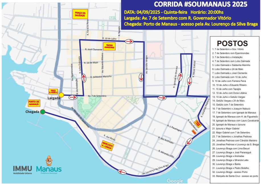 O Instituto Municipal de Mobilidade Urbana (IMMU) alerta os condutores que circulam pelo Centro sobre a interdição parcial e temporária que será realizada na noite de quinta-feira, 4/9, a partir das 20h, devido à primeira corrida do festival “#SouManaus”