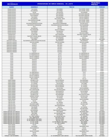 O programa Trata Bem Manaus segue ampliando os serviços de coleta e tratamento de esgoto na capital amazonense. Nesta semana, as ações ocorrem em turnos diurno e noturno, contemplando nove áreas distribuídas em cinco zonas da cidade. Os bairros que receberão as obras são: Cidade de Deus, Cidade Nova, Francisca Mendes, Japiim, Jorge Teixeira, Lírio do Vale, Nossa Senhora das Graças, Nova Cidade e Parque Dez de Novembro.