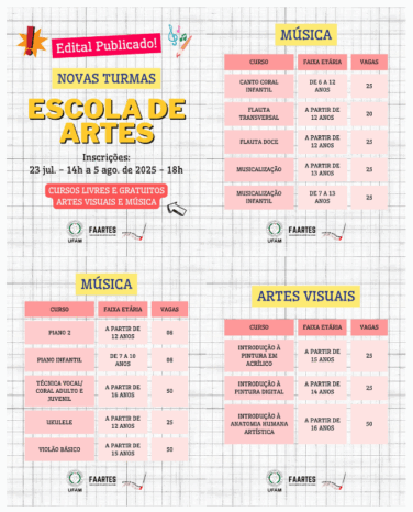 A Escola de Artes da Ufam abriu inscrições para 361 vagas em cursos livres e gratuitos nas áreas de Artes Visuais e Música, com início previsto para o segundo semestre deste ano. As oportunidades são presenciais e destinadas a crianças, jovens e adultos da comunidade interna e externa.